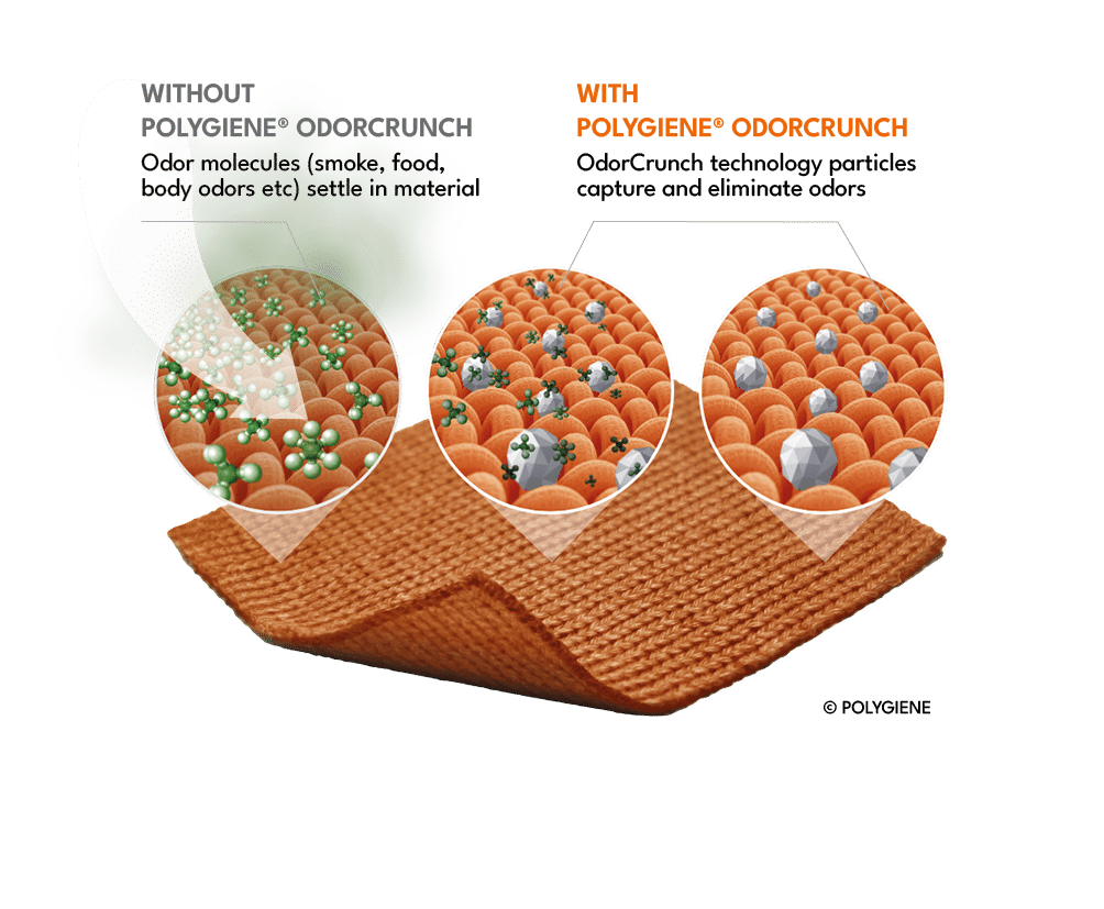 폴리진의 OdorCrunch는 직물의 일부이며, 의류의 내용 기간 전체에 걸쳐 냄새를 계속해서 분해합니다.